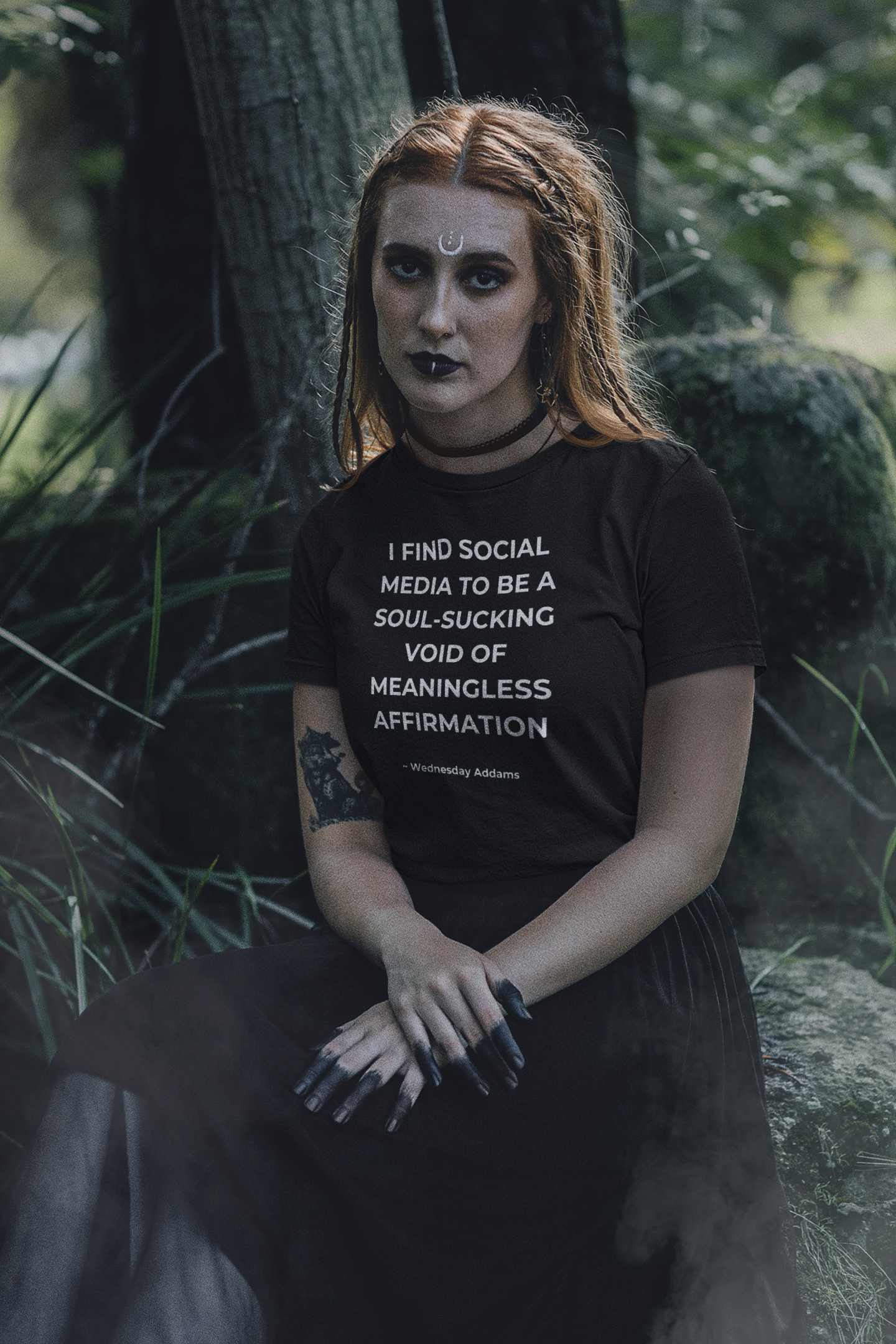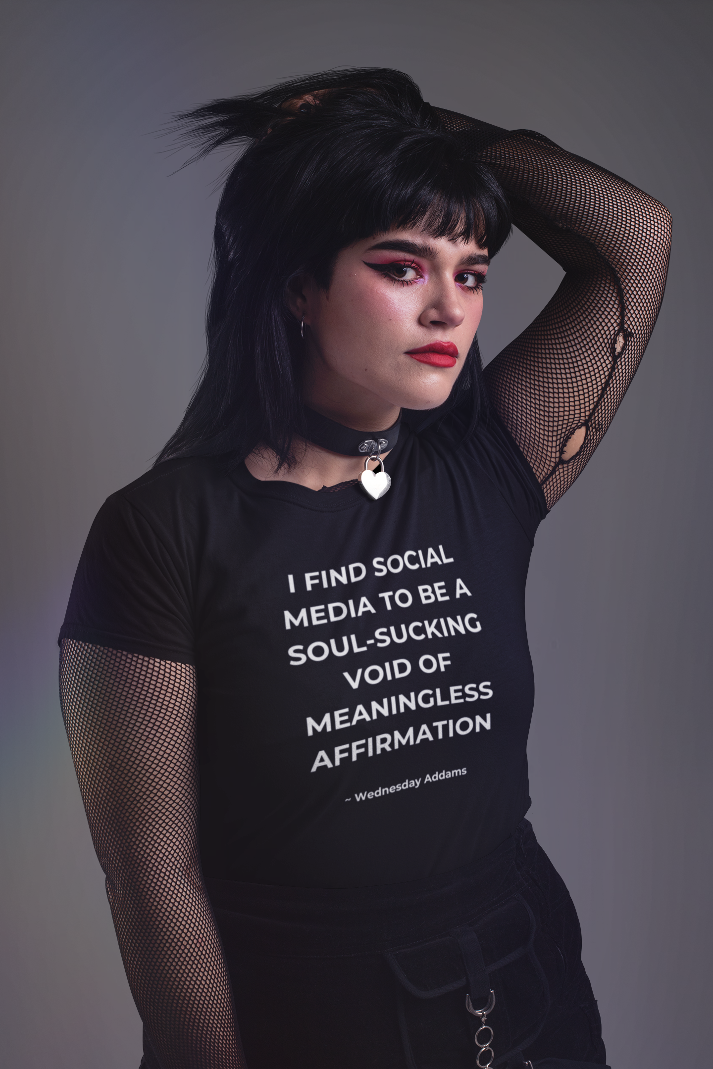 I find social media to be a soul-sucking void of meaningless affirmation. When you want to participate but have zero f*ck's to give, simply channel the sarcastic darkness of Wednesday Addams.